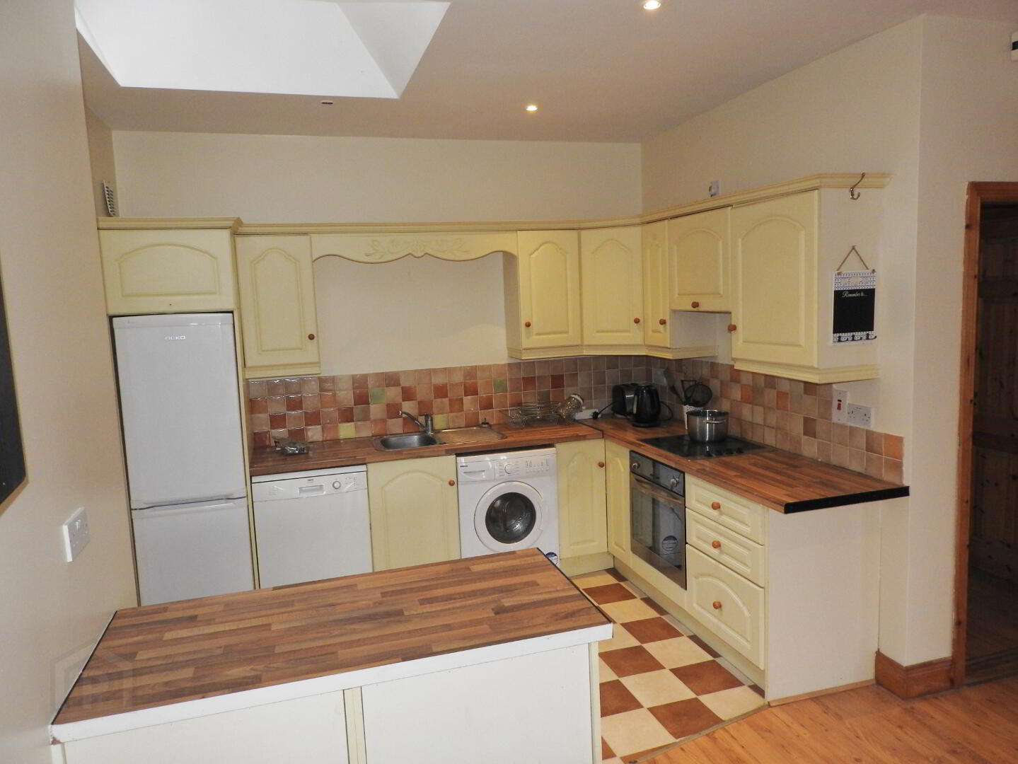 Open plan kitchen - dining- living area with timber effect flooring in the dining - living area, tiled floor in the kitchen, units at floor and eye level with tiled backsplash. Includes electric oven with 4 ring hob and extractor fan overhead, washing machine, dishwasher and fridge freezer. Recess lighting throughout. Front door leads directly into the living area and there's a door from kitchen out to the side of the property.