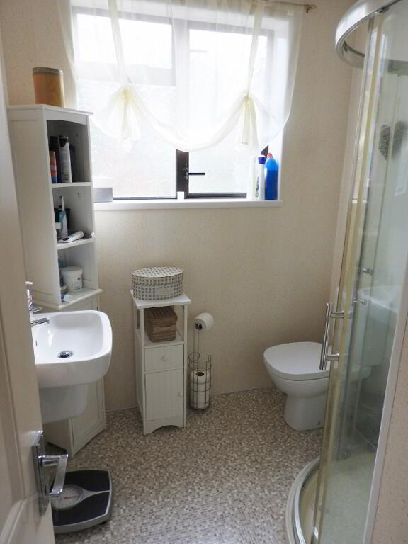 WHB and WC. Tiled floor.